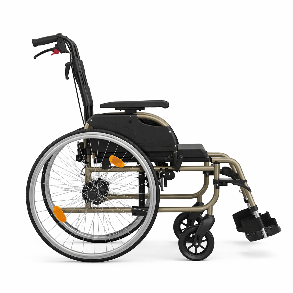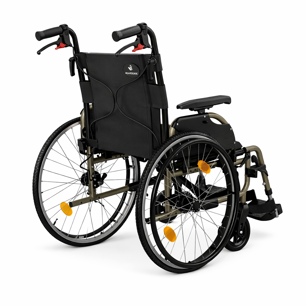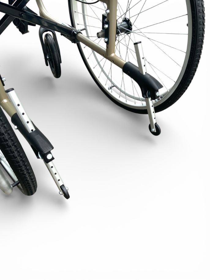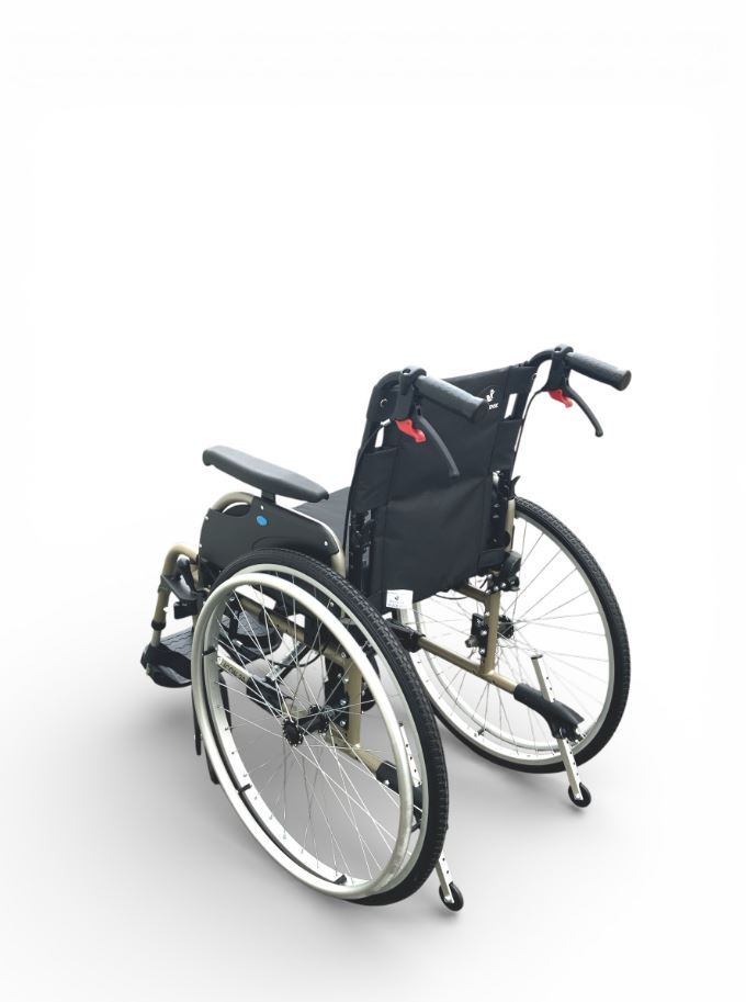 - Zadní kola jsou vybavena pevnými PU pneumatikami odolnými proti propíchnutí, s úchytným kroužkem pro pohon vlastními silami. Zadní kola lze jednoduše z vozíku sundat.