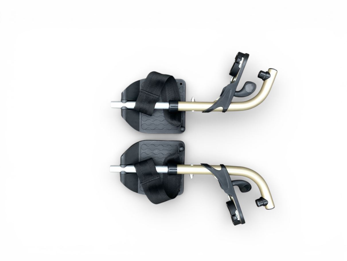 - Opěrky nohou jsou výklopné, úhlově nastavitelné s páskem na patu