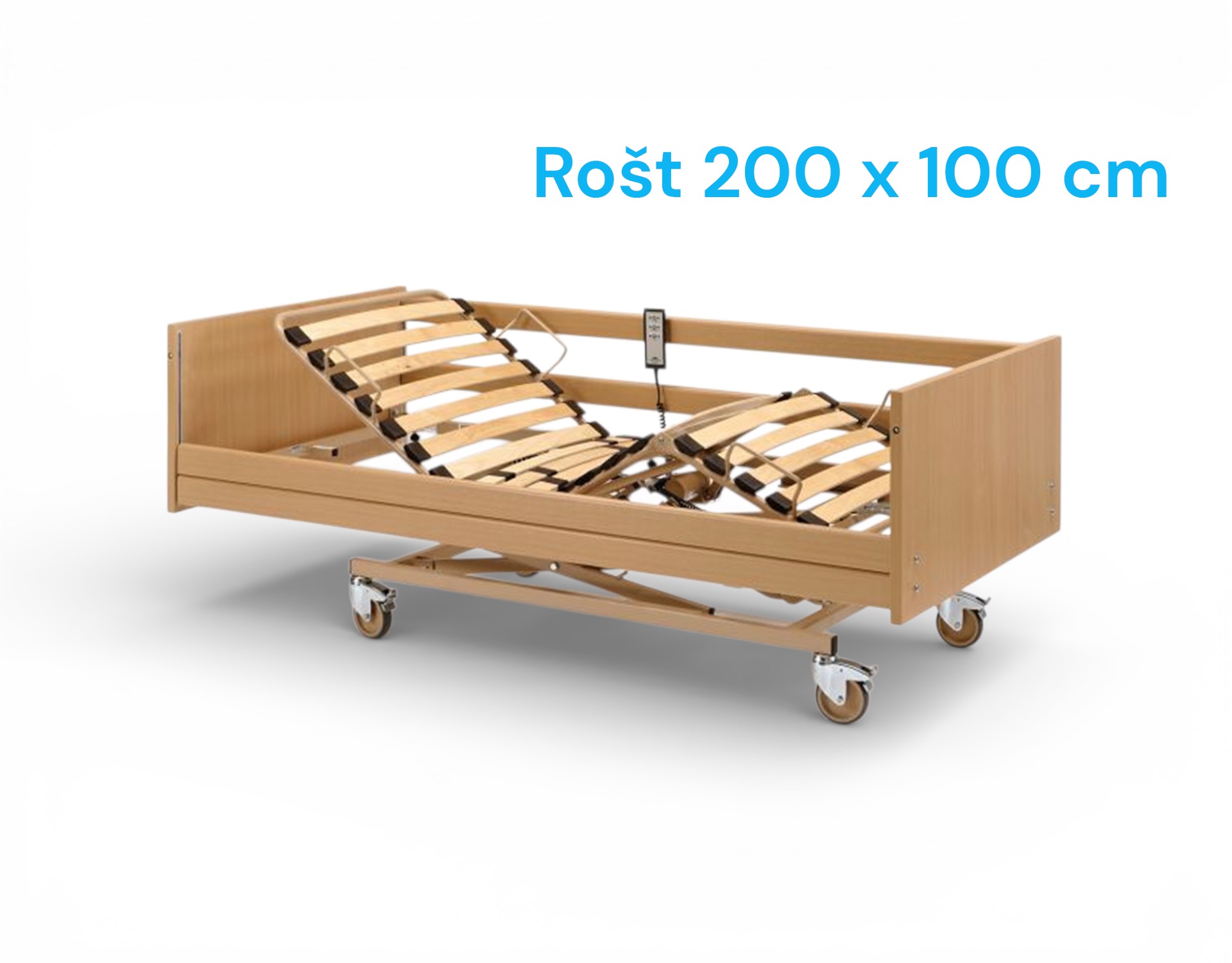 Lůžko nabízí tři funkce polohování, elektrický zdvih opory beder, nohou a výšky ložné plochy. Obsahuje brzditelná kolečka, hrazdu, dřevený lamelový rošt, bočnice i čela lůžka.