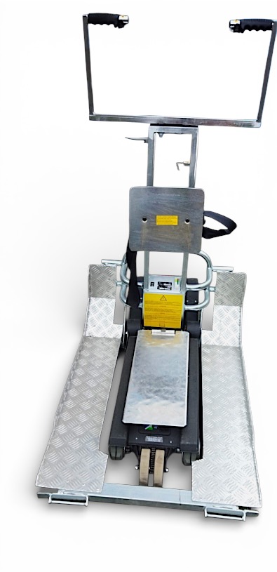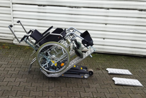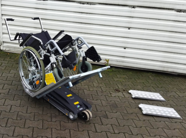 Repasovaný pásový schodolez TRG Jolly je určen pro přepravu pacienta po schodech za použití mechanického invalidního vozíku, součástí schodolezu jsou rampy na vozík.
